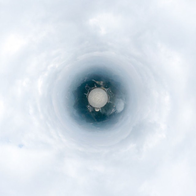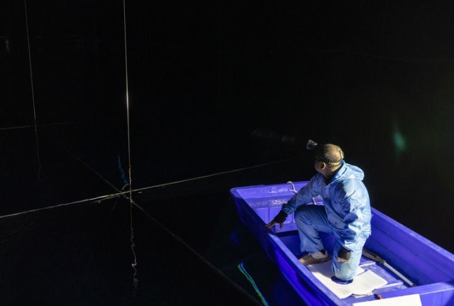 观测站“拉索”水切伦科夫探测器阵列水池正在位于四川省稻城县海子山的高海拔宇宙线,(2023年4月21日摄)科研职员坐船改换试验摆设。