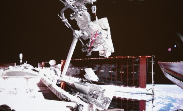 拍摄的神舟二十号航天员陈冬正在空间站组合体舱表使命的画面这是2025年5月22日正在北京航天飞翔把握核心屏幕上。